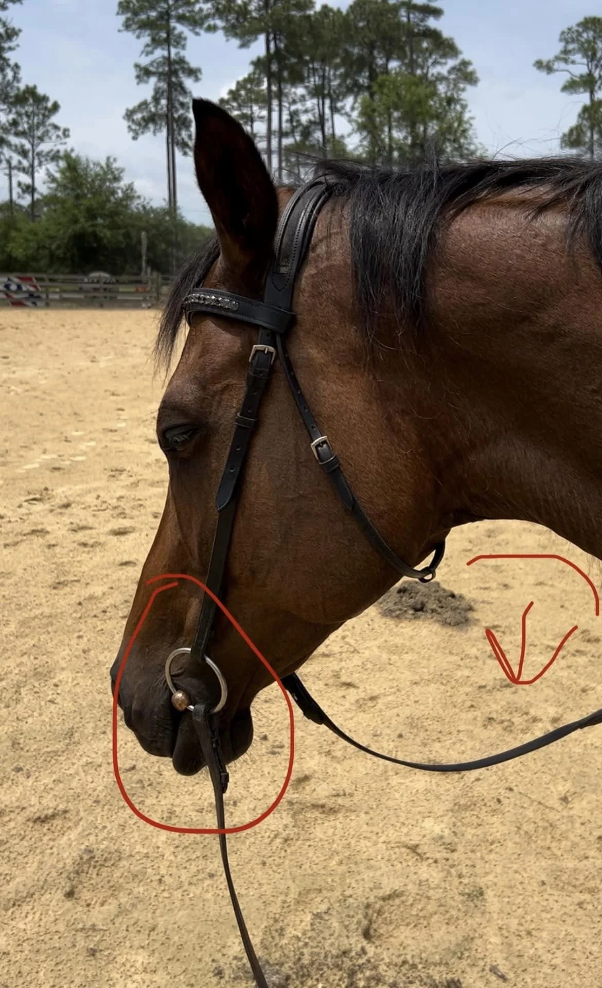 Pictured is after the jaw relaxation. The horse’s jaw is relaxed and so are the underneck muscles. The horse also has a visibly relaxed expression.